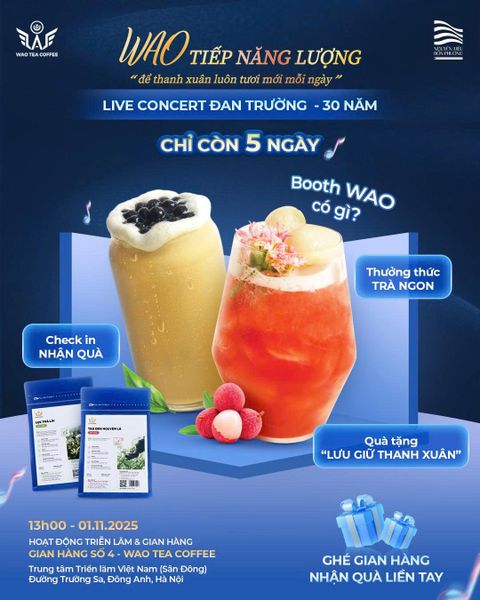 Với cam kết mang trà Việt chất lượng cao đến gần hơn với cộng đồng, WAO Tea Coffee không chỉ chú trọng vào chất lượng trong từng sản phẩm, mà còn mong muốn lan tỏa tinh thần tích cực và năng lượng tươi mới qua những trải nghiệm ý nghĩa cùng khách hàng.Ngày 01/11/2025, tại Trung tâm Triển lãm Việt Nam (Đông Anh, Hà Nội), đêm nhạc Live Concert “Đan Trường 30 Năm – Dấu Ấn Thanh Xuân” đã chính thức diễn ra, đánh dấu hành trình 30 năm cống hiến và tỏa sáng của nam ca sĩ Đan Trường trong lòng người hâm mộ.